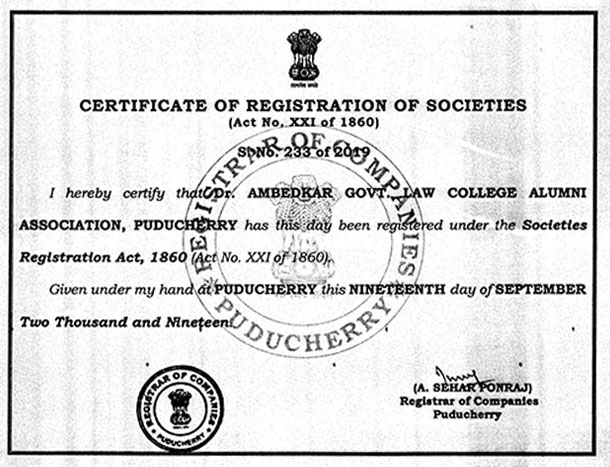 Dr. Ambedkar Government Law College Alumni Association, Puducherry is the formal body of the alumni of Dr. Ambedkar Government Law College, Puducherry formerly known as Government Law College Pondicherry. It acts as a bridge between the past and the present of the Institution. The Alumni Association it was registered under the Societies Registration Act of 1860 (Act no. XXI of 1860) bearing Registration No. 233 of 2019. Now it functions from an office located at the Administrative Building of the Institution. At present, there are more than six hundred registered Alumni Members of the Institution spread all over India.